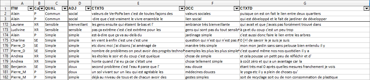 Ce corpus a été analysé à l'aide du logiciel d'analyse textuelles TXM (Heiden et al., 2010), par personne interviewée et par catégorie d'interviewés comme sous-parties du corpus. Les volumes se situent entre 6000 et 14000 mots par interview ; ils sont relativement équilibrés. Les sous-parties du corpus contiennent respectivement, 42888 mots pour les permaculteurs, 32722 mots pour Extinction Rebellion et 43801 mots pour les sympathisants écologiques.