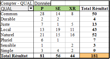 Trois ensembles de qualités ressortent largement, à savoir le commun, le local et le naturel. Au total, ils représentent 81% des attestations. Les registres du juste (7%), du simple (5%), du pluriel (4%), du sensible et du durable (2% chacun), représentatifs des paradigmes analytiques savants, se révèlent quant à eux de bien moindre importance.